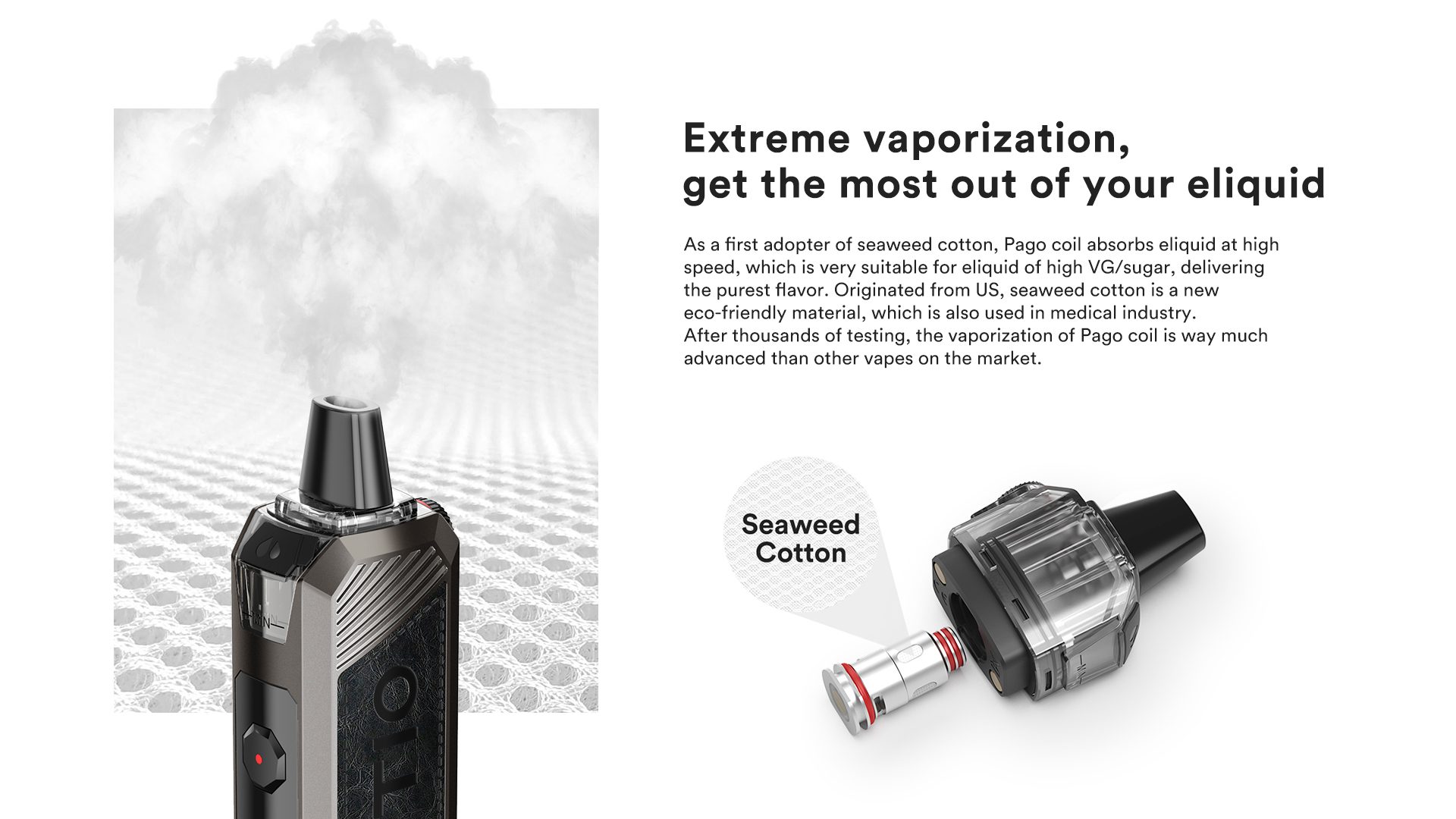 1.As a first adopter of seaweed cotton,Pago coil absorbs eliquid at high speed, which is very suitable for eliquid of high VG/sugar, delivering the purest flavor.Originated from US,seaweed cotton is a new eco-friendly material, which is also used in medical industry.