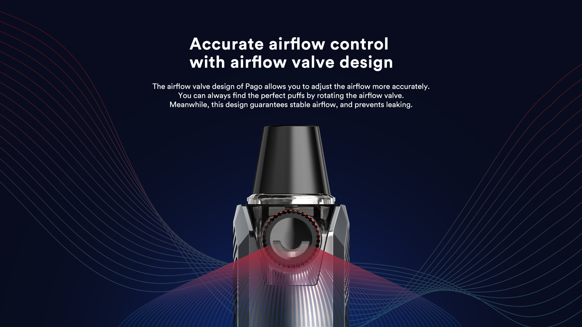 1.The airflow valve design of Pago allows you to adjust the airflow more accurately. 2.You can always find the perfect puffs by rotating the airflow valve. Meanwhile,this design guarantees stable airflow,and prevents leaking.