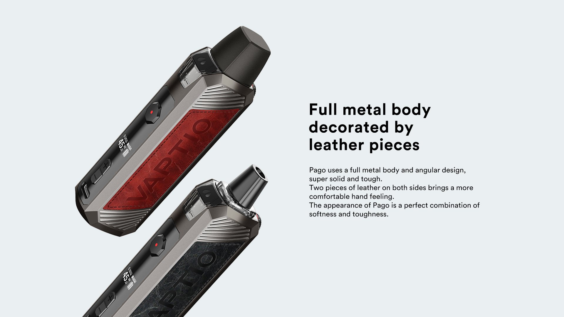 1.Pago uses a full metal body and angular design, super solid and tough. 2.Two pieces of leather on both sides brings a more comfortable hand feeling. 3.The appearance of Pago is a perfect combination of softness and toughness.