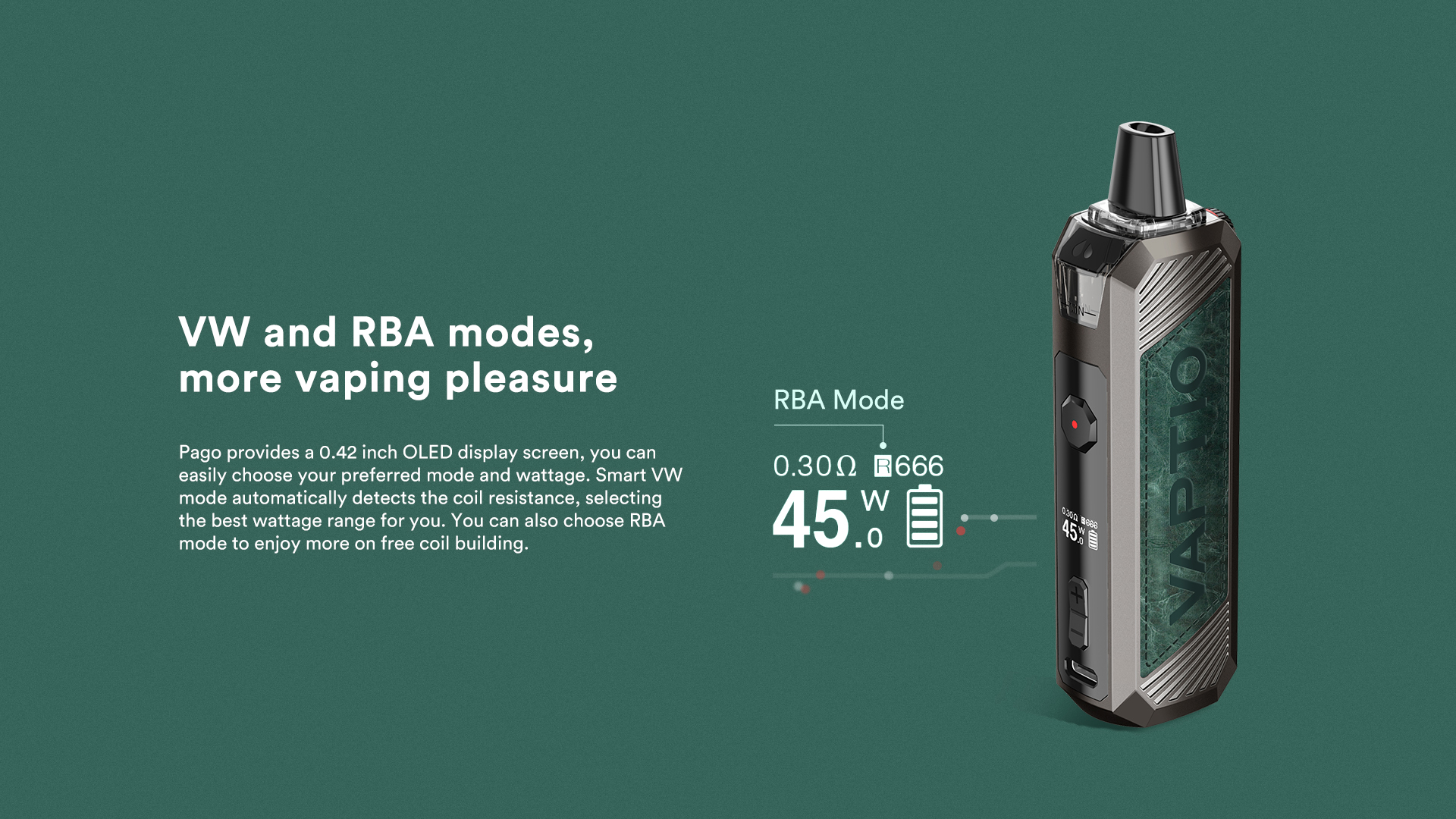 VW and RBA modes, more vaping pleasure.