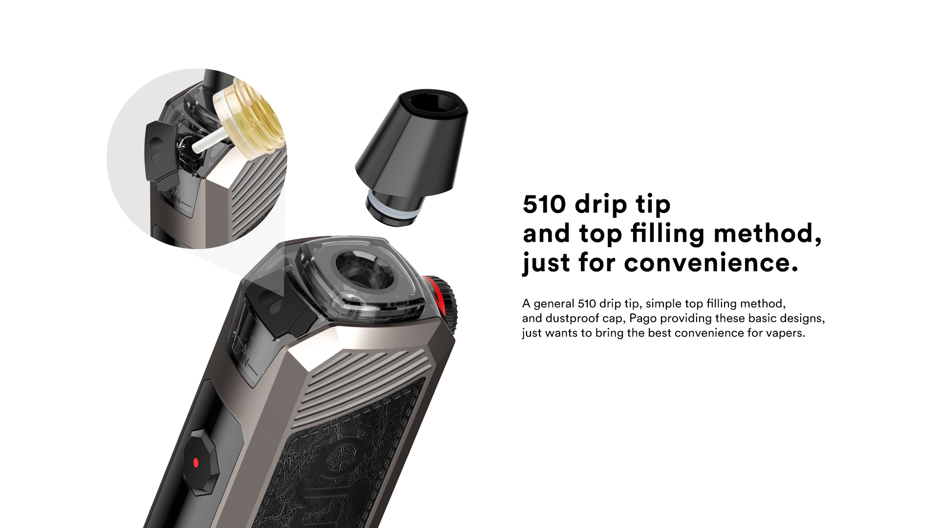 A general 510 drip tip, simple top filling method, and dustproof cap,Pago providing these basic designs, just wants to bring the best convenience for vapers.