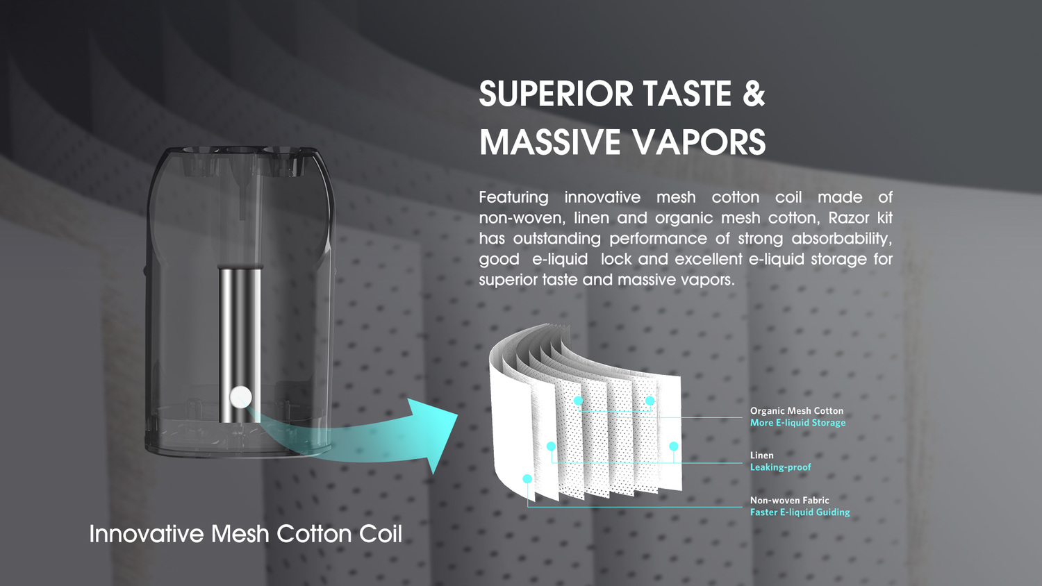 It features a PCTG-made top-filled cartridge whose drip tip can be detached for e-liquid filling and innovative mesh cotton coil for massive vapors and superior flavor satisfaction.